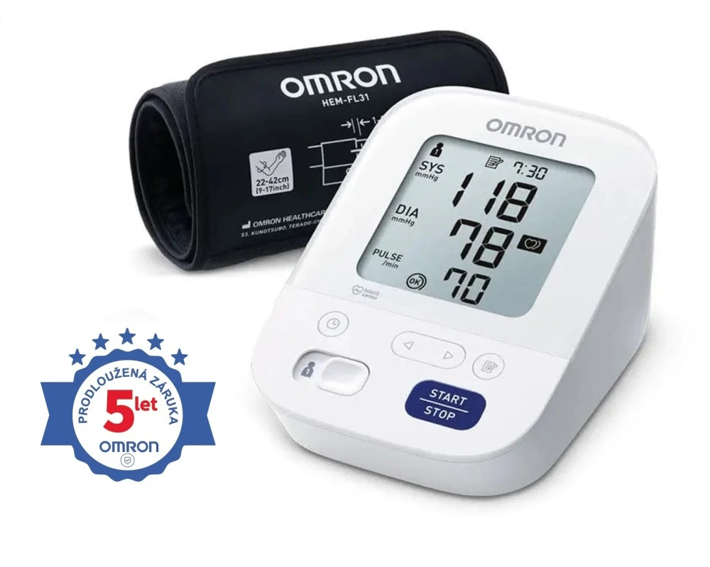 Přístroj OMRON M3 Comfort 2020 je vylepšený model s novým intuitivním designem pro ještě snadnější použití.Jedná se o tlakoměr na paži s velkým, přehledným a čitelným displejem, univerzální prodlouženou Intelli manžetou (odstraňuje chyby při jejím nesprávném umístění) a řadou funkcí (indikátor vysokého tlaku, kontrola utažení manžety, indikátor pohybu při měření, detekce arytmie, dělená paměť pro 2 uživatele + režim host). Přístroj využívá jedinečné technologie Intellisense. Na přístroj se vztahuje prodloužená záruka 5 let.